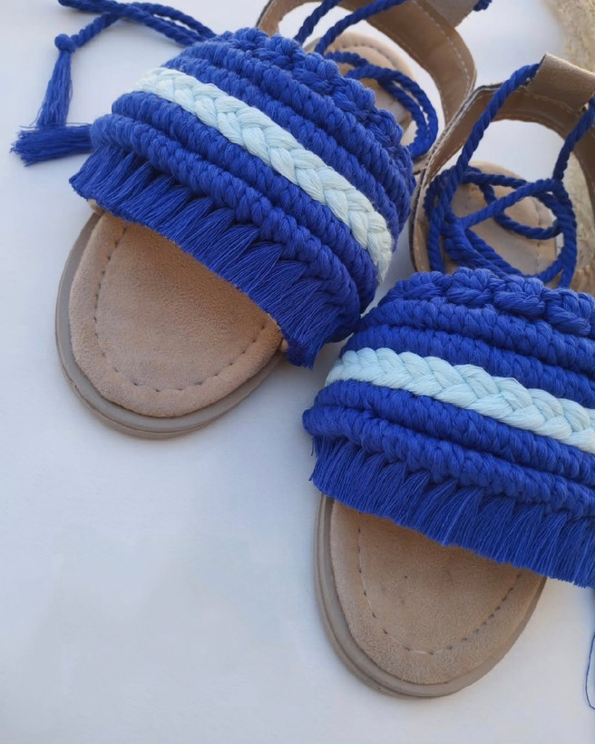 صندل مکرومه بند دار آبی کاربنی | سندل زنانه مکرومه بند دار آبی کاربنی